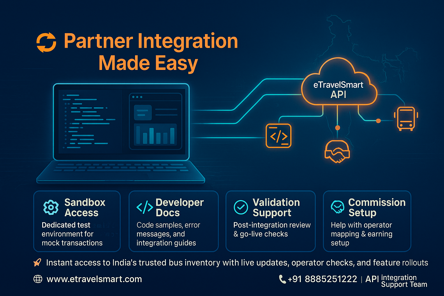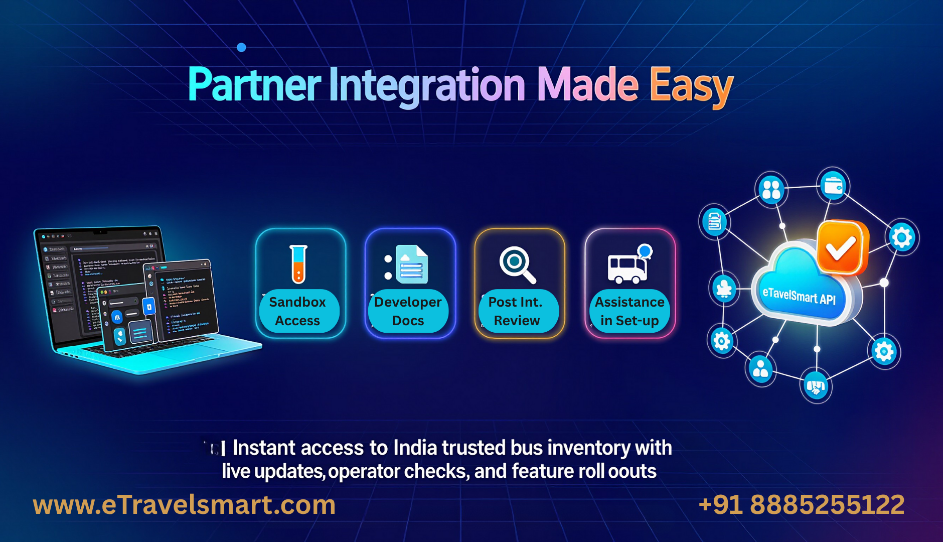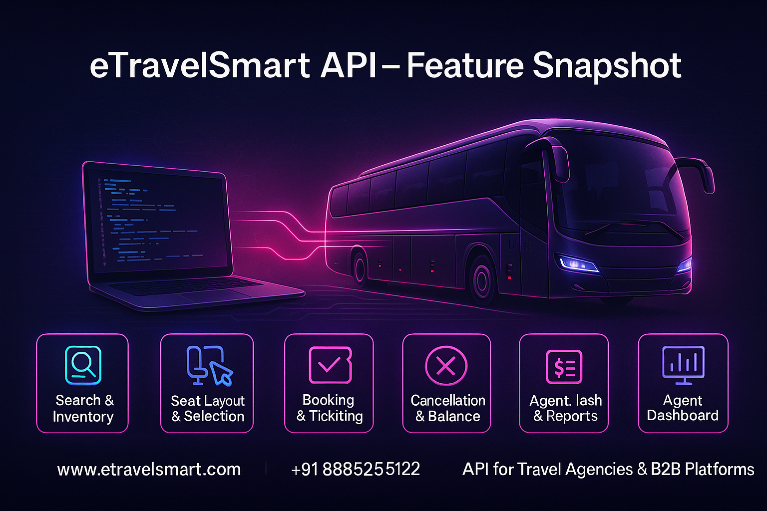 Launch your online bus ticket booking portal instantly with eTravelSmart. Access 3,000+ operators, 80,000+ routes, real-time APIs, and integrated dashboards. Focus on branding and growth while eTravelSmart handles technology, inventory, and backend support.