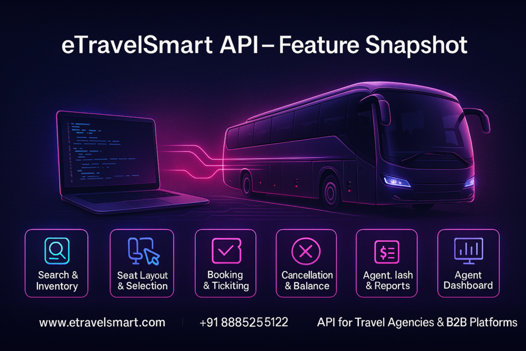Boost your travel business with eTravelSmart Bus Booking API. Get real-time access to 3,000+ operators, 80,000+ routes, live seat availability, partial payment booking, instant refunds, and secure integration. Designed for OTAs and travel startups to scale faster with high uptime and transparent commissions.